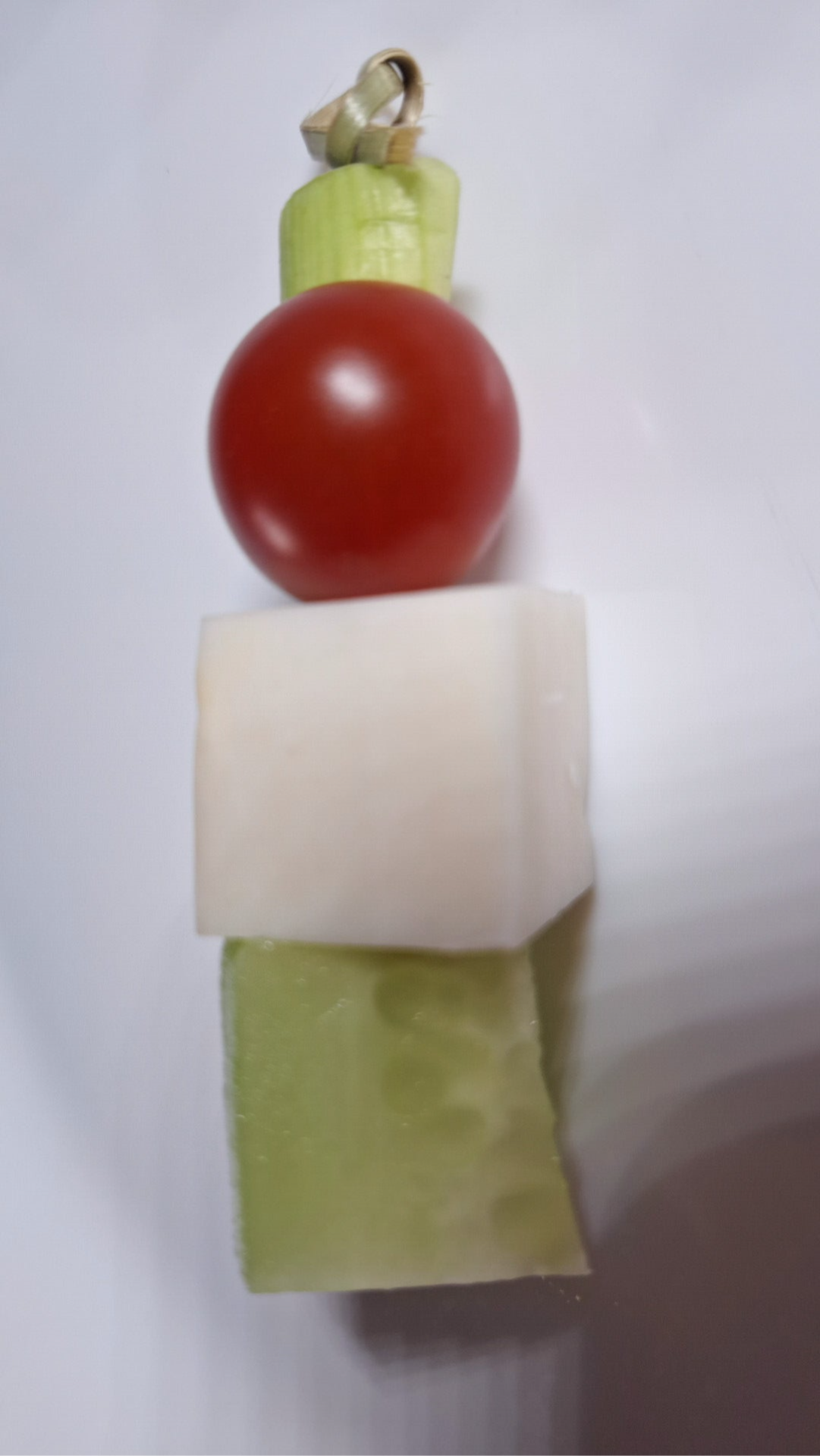 50+ geitenkaas met frisse komkommer en tomaatmet een klein pikant bosuitje er op.